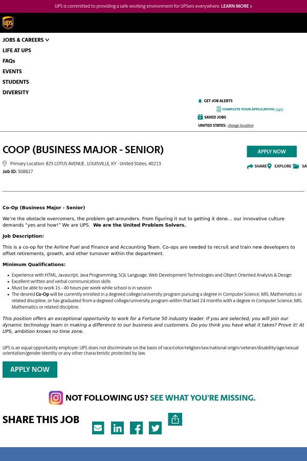 Coop Business Major Senior Job At Ups In Louisville Ky 48637822 Tapwage Job Search